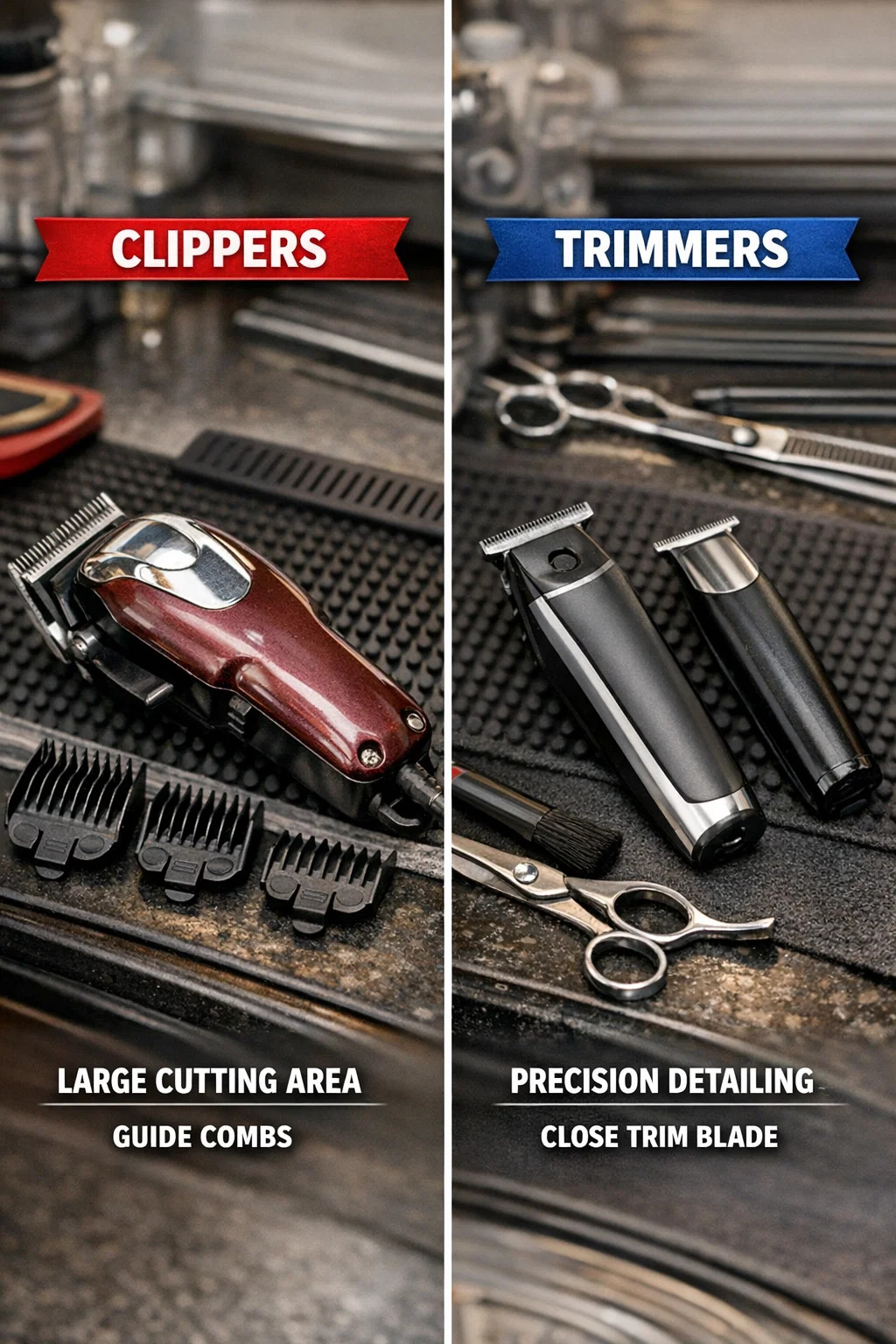 バリカン: 刃は大きく、通常はさまざまな長さの「ガイド コーム」が多数付属しています。それらのデザインは、肌に近づけることを目的としたものではなく、髪を3mm、6mm、あるいはそれ以上の長さに均一にカットできるようにすることを目的としています。