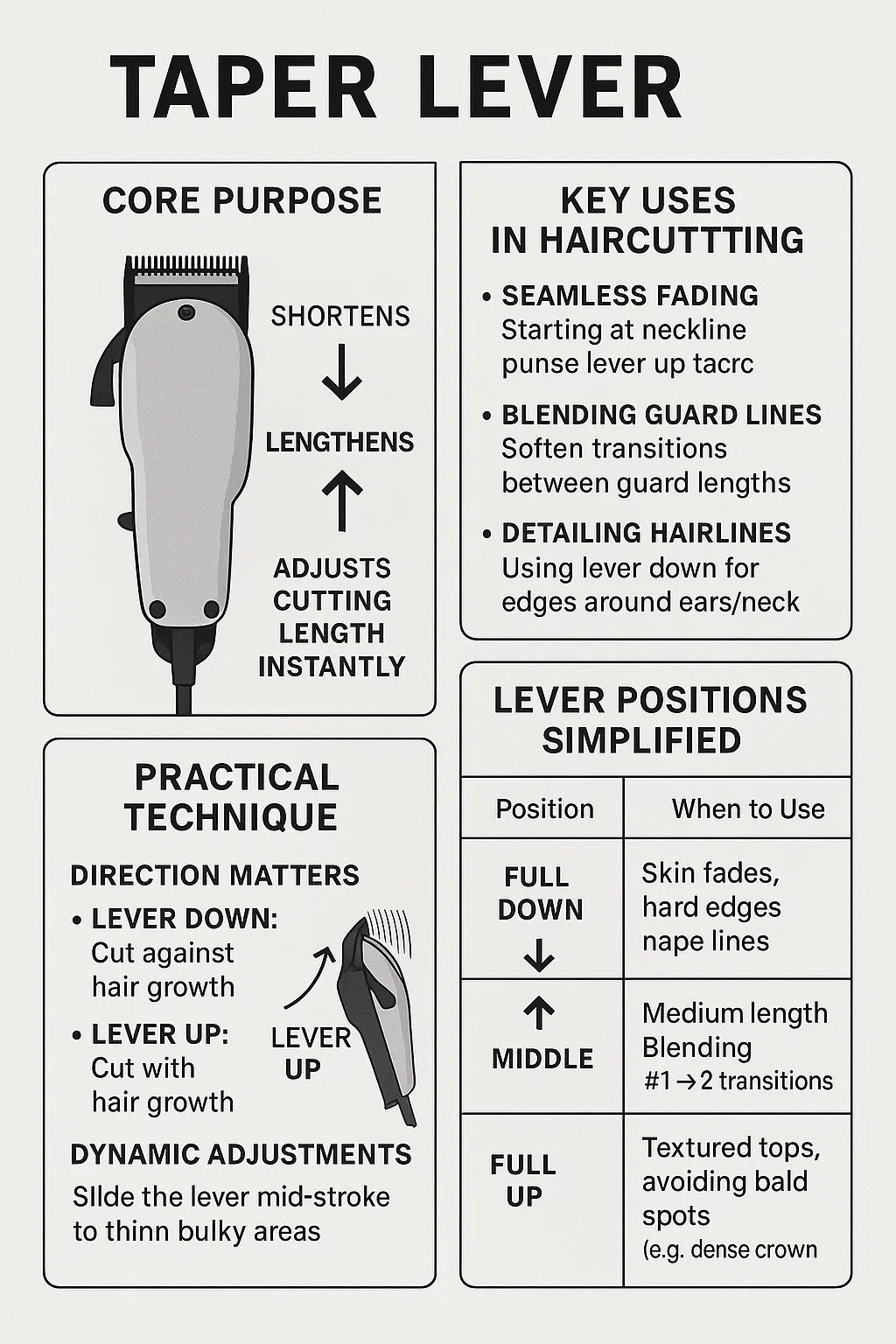 レバーがオン バリカン (テーパー レバーまたはブレード調整レバーと呼ばれることが多い) は、プロのヘアカットに不可欠な正確な機能を果たします。以下は実際的な内訳です。