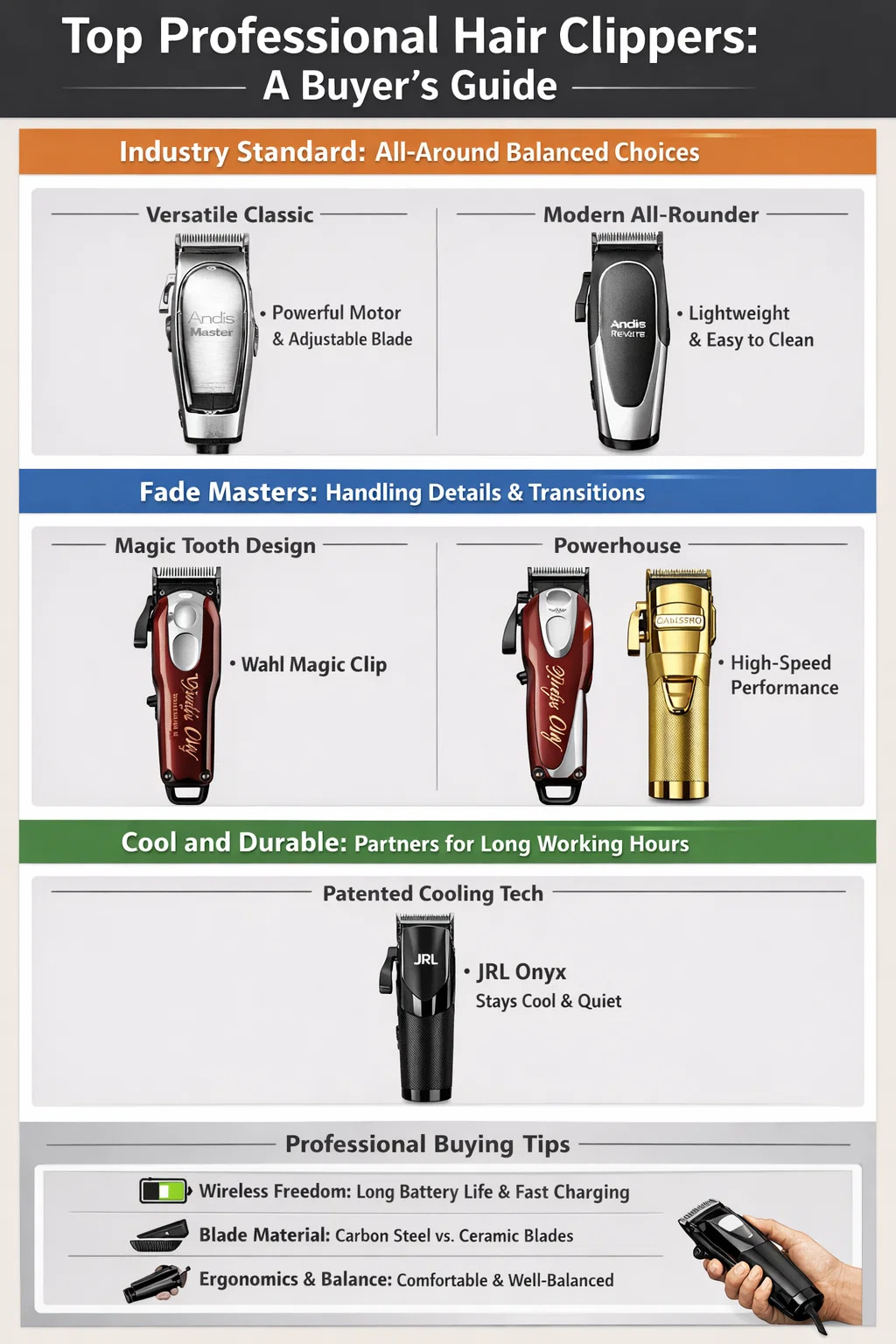 モダンなオールラウンダー (例: Andis ReVite): 近年非常に人気のある新参者です。従来のマシンの強力なパフォーマンスと最新の軽量設計を組み合わせています。長時間保持しても快適で、ブレードは簡単に取り外して掃除できるため、高負荷の作業環境に最適です。